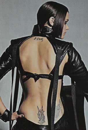 She has a rather large fairy tattoo on her lower back, plus a few other tattoos which include, a symbol on her lower abdomen, a small phrase on her left arm, plus a diamond and club on her wrists.